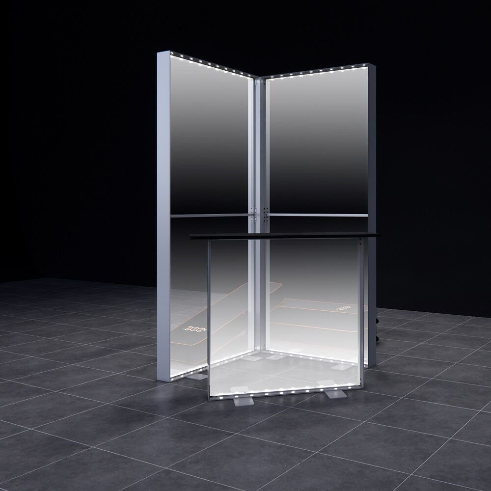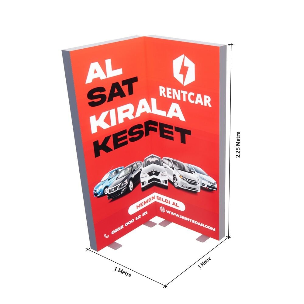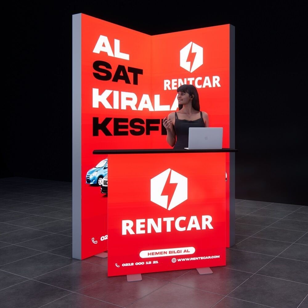 Küçük fuar stant alanlarınızda, mağaza vitrinlerinizde veya etkinlik köşelerinde dikey bir vurgu yaratmak için ideal, kompakt 'L' şeklinde ve tamamen aydınlatmalı bir pano çözümü mü arıyorsunuz?