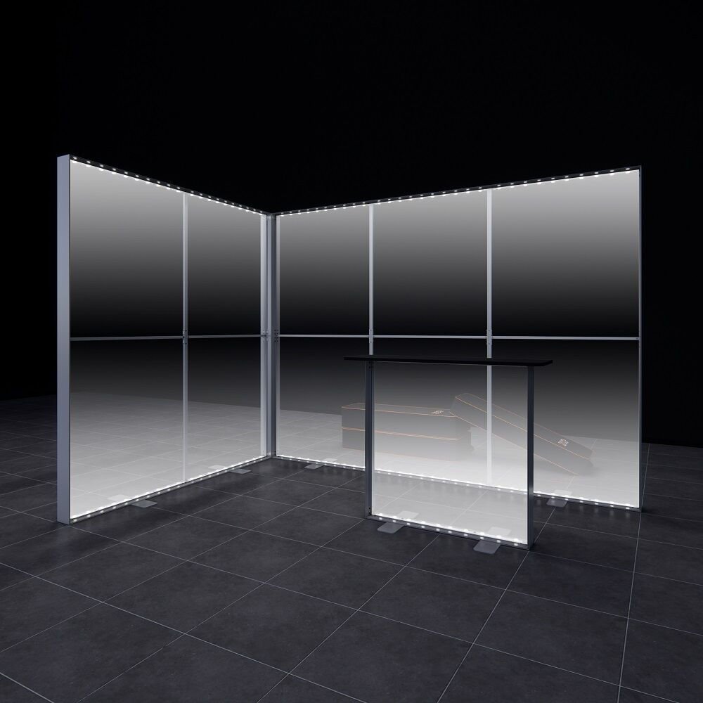 İşte size 3 metre ve 2 metre duvar uzunluklarıyla güçlü, asimetrik bir 'L' şekli oluşturan, iki modüllü, yüksek parlaklıkta ve lojistik açıdan pratik çözüm: 3x2m h225cm Lightbox L Stand.