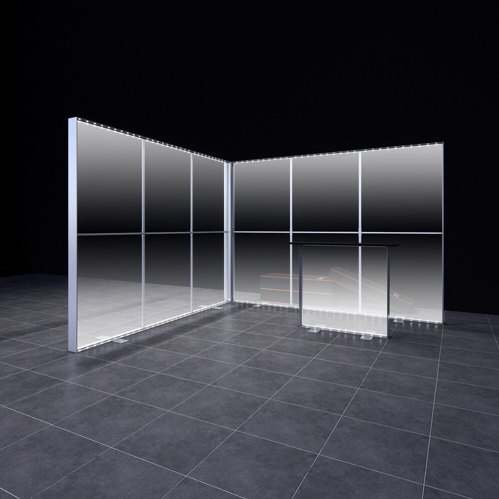 İşte size 3 metreye 3 metre ölçülerinde (toplam 6 metre duvar uzunluğu) simetrik bir 'L' şekli oluşturan, iki modüllü, yüksek parlaklıkta ve pratik çözüm: 3x3m h225cm Lightbox L Stand.