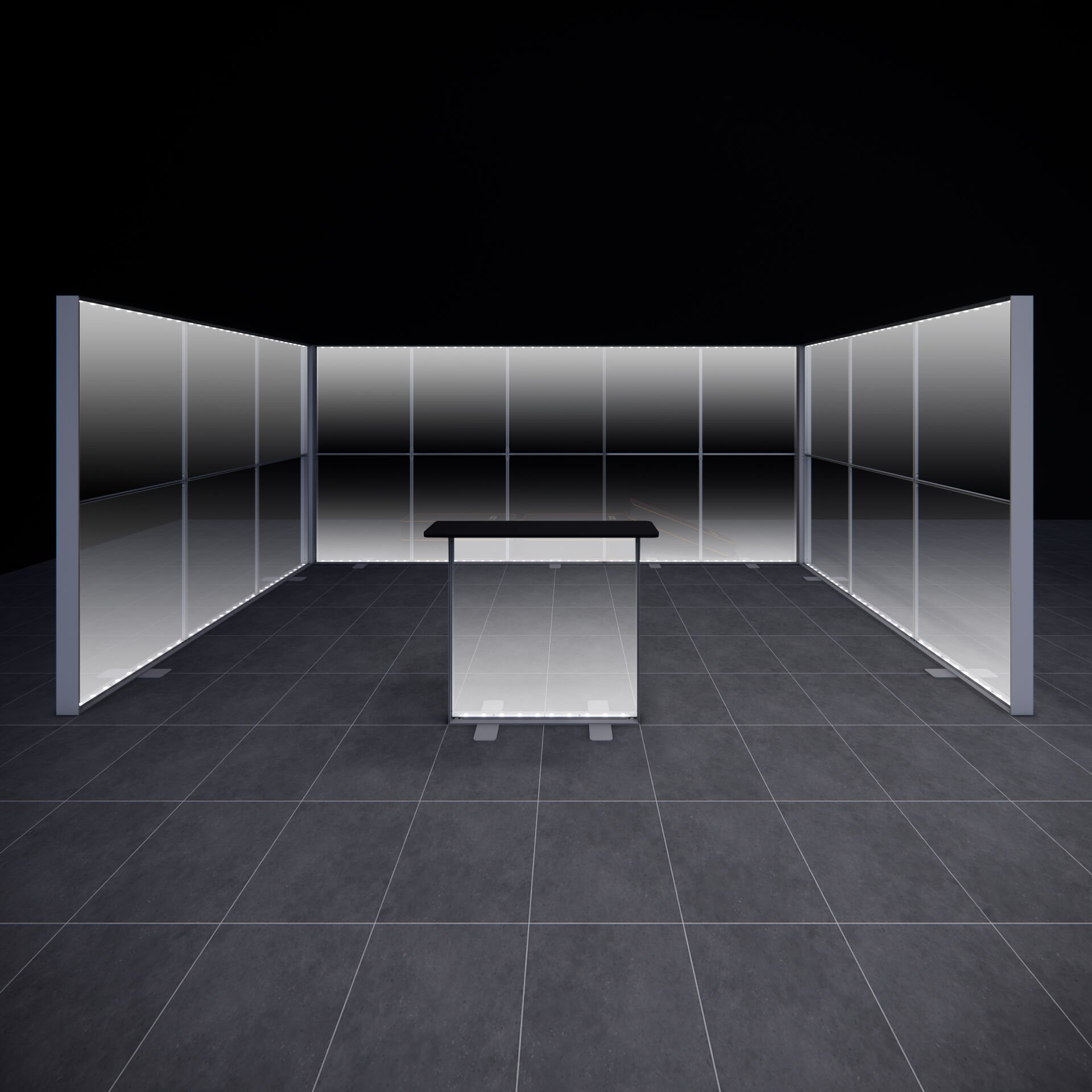 İşte size 3 metre derinliğinde ve 5 metre genişliğinde bir U şekli oluşturan, dört modüllü, üstün aydınlatmalı ve kapsayıcı çözüm: 3x5m h225cm Lightbox U Stand.