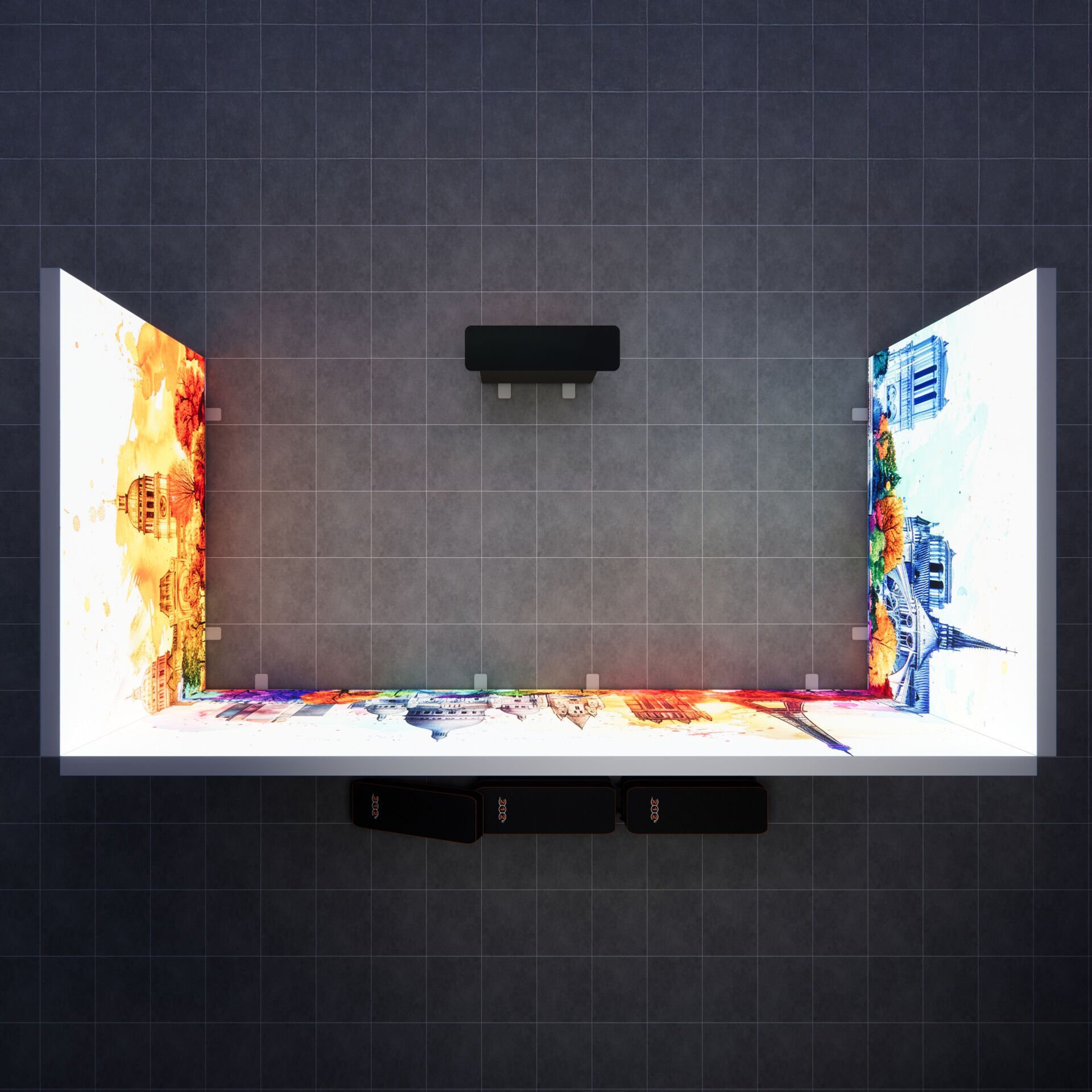 4 Eşit Modüllü Esneklik: Stand, dört adet 300xh225cm lightbox modülünün bir araya gelmesiyle oluşur. Bu eşit boyutlu modüller, panel birleştirme aparatları ile hızlıca bağlanır. Eşit modüller sayesinde görsellerin tasarımı ve modüllerin farklı konfigürasyonlarda (örneğin 6m düz arka duvar, 3+3m L stand vb.) kullanımı kolaylaşır.