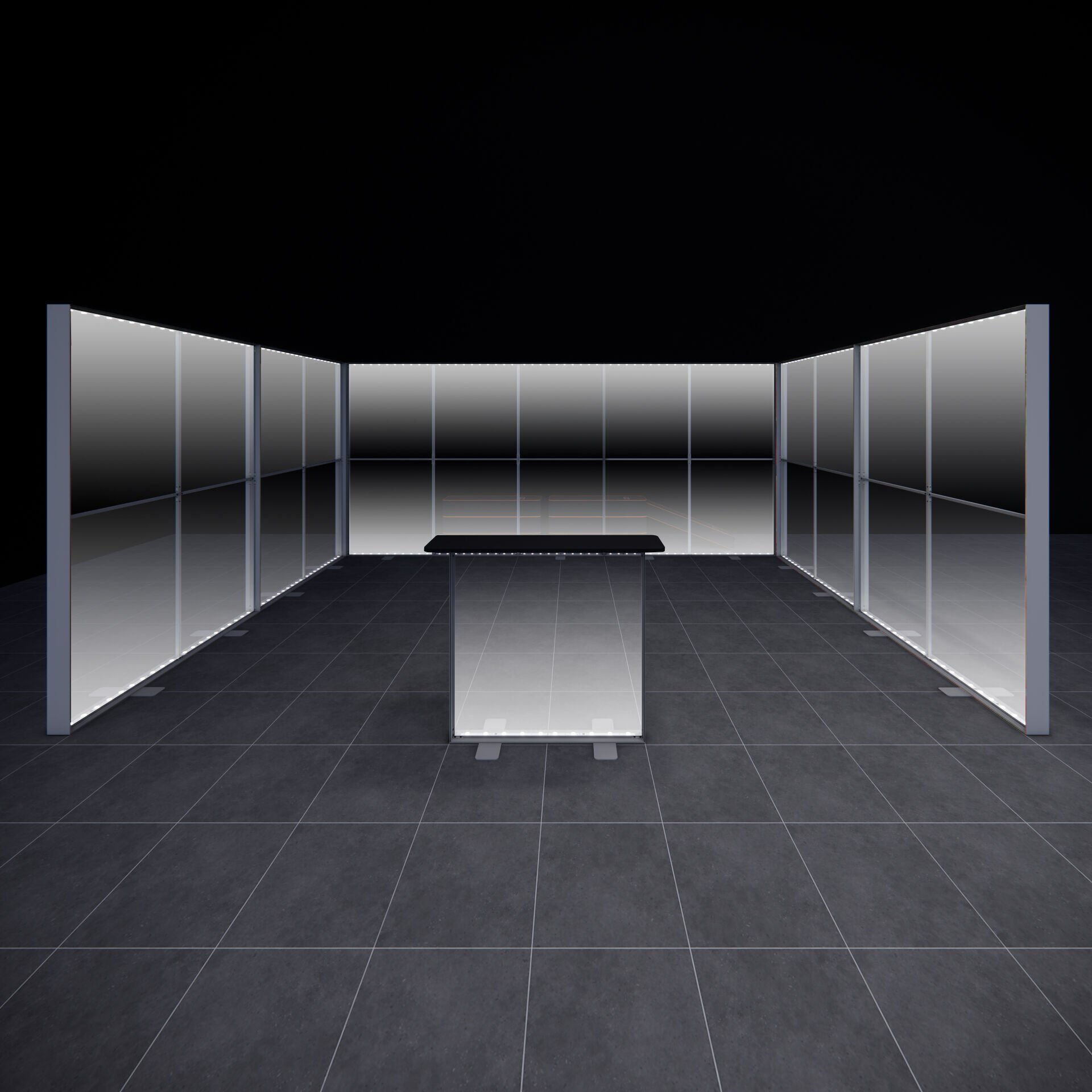 Geniş bir fuar alanı veya sergi salonu için, ziyaretçiyi odak noktasına alan, üç duvarlı (U şeklinde), tamamen aydınlatmalı ve profesyonel bir stand sistemi mi tasarlıyorsunuz?
