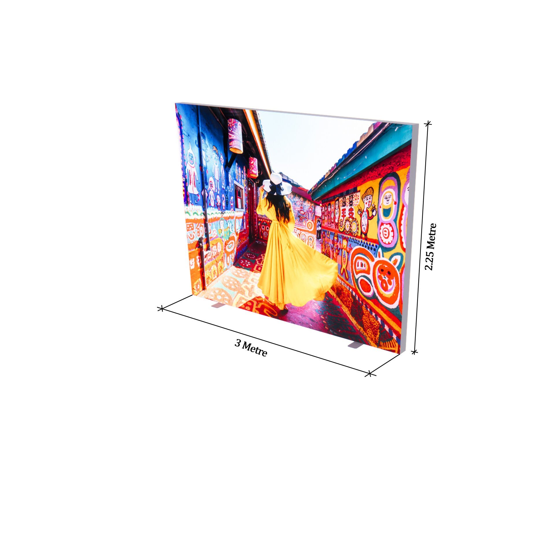 İşte size 3 metre genişliği ve 2.25 metre yüksekliği ile maksimum görünürlük sunan, tek modüllü, üstün aydınlatmalı ve demonte çözüm: Ayaklı Lightbox 300xh225cm.
