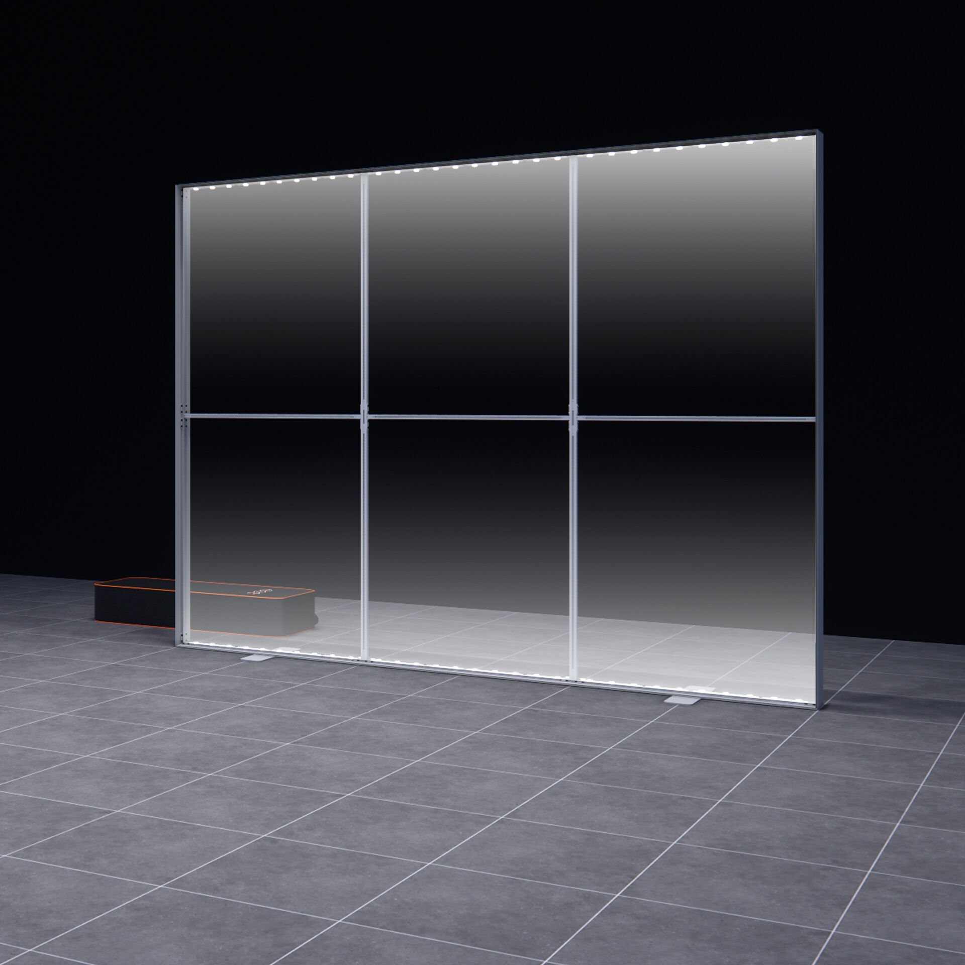 Modüler Kullanım: Ayaklı Lightbox 300xh225cm, tek başına kullanılabileceği gibi, diğer lightbox kasalarıyla birleştirilerek daha büyük arka duvar sistemlerinin bir parçası olarak da görev yapabilir.