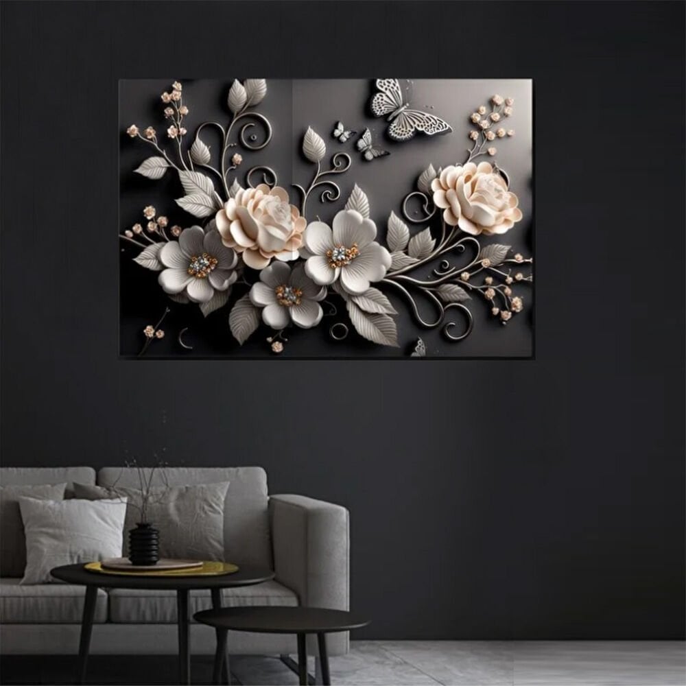 Özel Tasarım 3 Boyutlu Lüks Siyah Çiçekler Dekoratif Kanvas Duvar Tablo